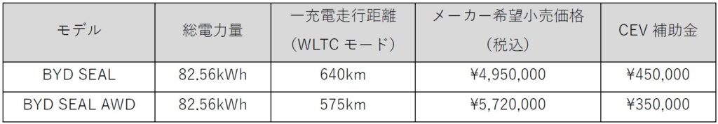 • 新価格は、BYD SEAL RWDが495万円、BYD SEAL AWDが572万円(税込み)