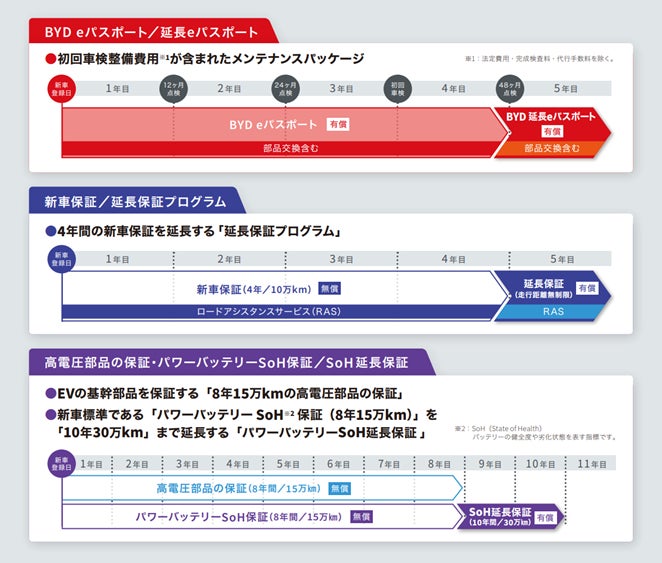 本プログラムの導入の背景として、“一次ユーザーの使用年数の長期化”及び“BYDユーザー(=EVユーザー)が相対的に多走行である”ことに着目し、これまで標準でご提供していた「パワーバッテリー SoH保証(8年15万km)」を最長10年・30万kmまで延長できるプログラムを導入しました。※3。これは国内における自動車メーカーのパワーバッテリーの保証制度としては最長であり、パワーバッテリーの容量低下に対する不安を抱えるお客様に、より安心・安全なEVライフをお楽しみいただくことを目指しています。