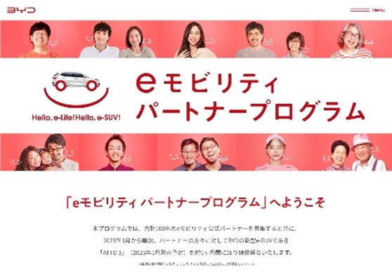 BYDの日本法人であるBYD Auto Japan株式会社(本社:神奈川県横浜市、代表取締役社長:東福寺 厚樹)は、BYDのeモビリティを通じて実現できる新しいライフスタイル「e-Life」を体験・発信していただく「eモビリティ パートナープログラム」のパートナーを、本日2022年9月30日(金)より募集開始いたします。