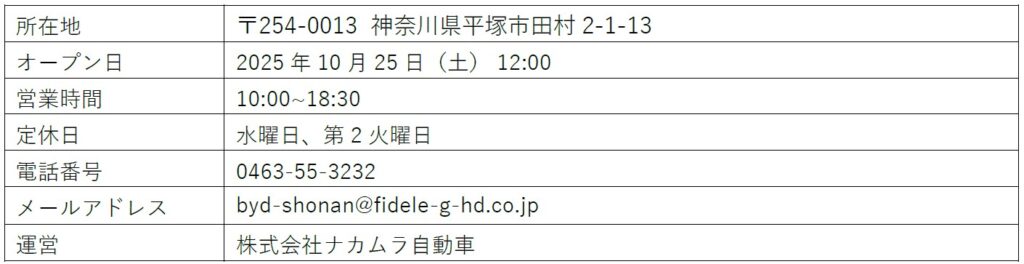 BYDの日本法人であるBYD Auto Japan株式会社(本社:神奈川県横浜市、代表取締役社長:東福寺 厚樹、略称:BAJ)の正規ディーラーである株式会社ナカムラ自動車(本社:鹿児島県鹿児島市、代表取締役社長:中村 大輔)は、2025年10月25日(土)12時に、全国で47店舗目となるショールームを備えた正規ディーラー店舗「BYD AUTO 湘南」をオープンします。
