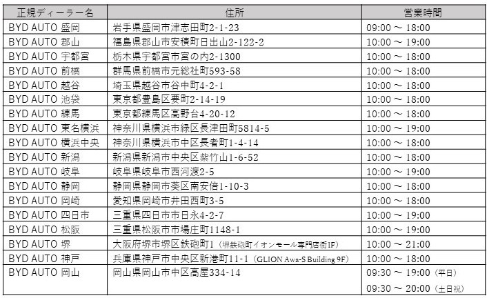 以下のBYD AUTO正規ディーラーで、車両の受け渡し・返却を受け付けております。車両予約方法や、対応可能な店舗などの詳細は、WEBサイト(URL:https://byd.co.jp/e-life/anyca_carsharing/)をご参照ください。
