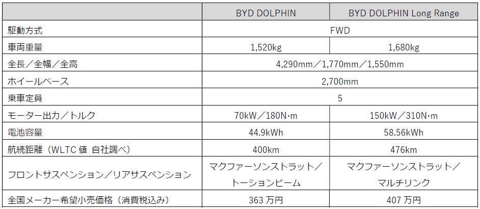 BYDの日本法人であるBYD Auto Japan株式会社(本社:神奈川県横浜市、代表取締役社長:東福寺 厚樹、以下 BYD Auto Japan)は、日本発売モデル第2弾となるコンパクトEV「BYD DOLPHIN(読み:ビーワイディードルフィン)」の全国メーカー希望小売価格を363~407万円(消費税込み)とし、本日2023年9月20日(水)より全国のBYD正規ディーラー(店舗/開業準備室)を通じて販売を開始いたします。