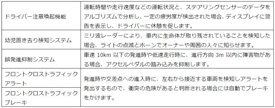 上記の他にも、「BYD DOLPHIN」は両グレードで充実した安全・運転支援システムを標準搭載しています。詳細は、【参考資料①:BYD DOLPHIN 主要諸元・主要装備一覧】をご参照ください。