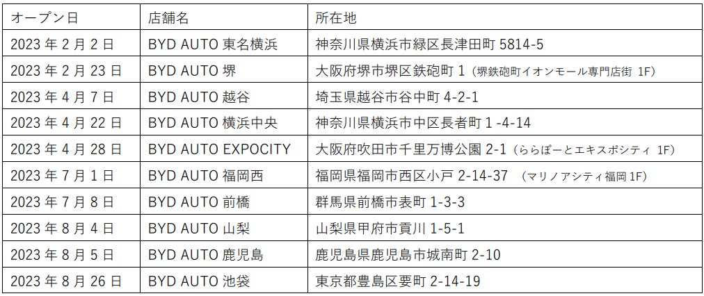 BYD Auto Japanは、2025年末までに100を超えるショールームを備えた店舗を全国に作ることを目標に掲げています。ショールームを備えた正規ディーラー店舗として、2023年2月にオープンした「BYD AUTO東名横浜」を皮切りに、以下10店舗をオープンいたしました。