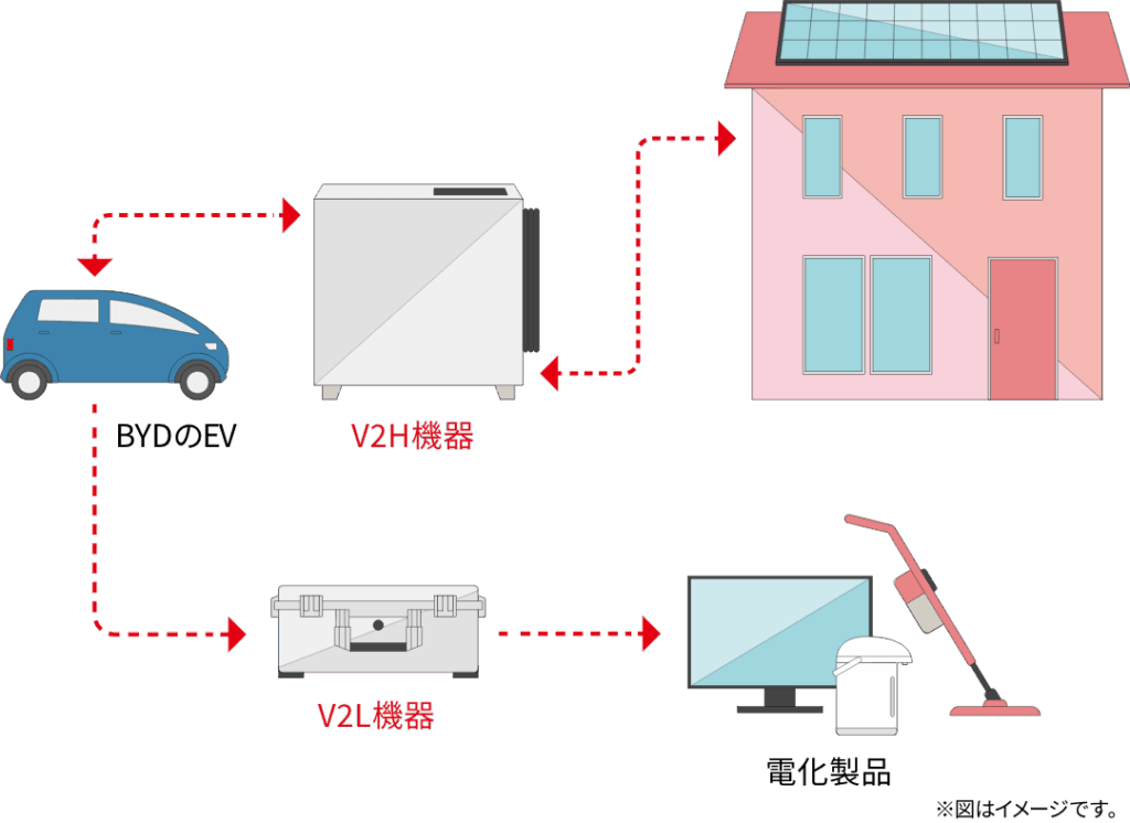 BYDの電気自動車は、バッテリーに蓄えた電力を取り出せる給電機能を備えています。最大1,500Wの電力で電化製品を使用できる「V2Lアダプター」が搭載されており、自動車に蓄えられた電力を家庭や家電に給電する「V2H / V2L」に対応しております。そのため災害等により停電が発生した際にはBYDの電気自動車を電力供給源として活用することができます。例えばBYD ATTO 3からは1世帯の約4日分※2の電力を供給可能です。