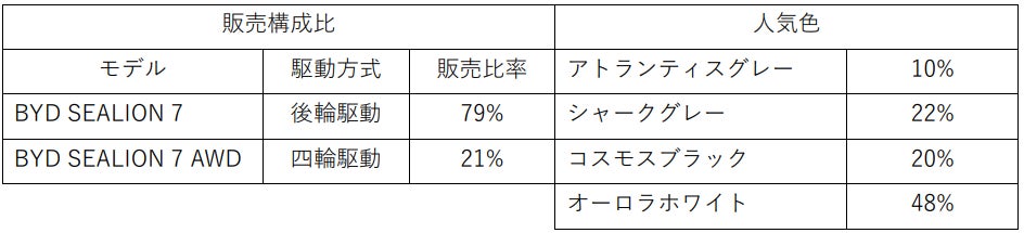 「BYD SEALION 7」はそのプライスインパクトとバリューフォーマネーであることが多くのお客様に評価されました。特にメーカー希望小売価格で500万円を切る後輪駆動の人気が高く、BYD SEALION 7に占める後輪駆動の販売比率は約6割で販売台数の増加に寄与しました。「BYD SEALION 7」の人気のボディカラーは、オーロラホワイトがトップの48%で、以降、シャークグレー(22%)、コスモスブラック(20%)、アトランティスグレー(10%)の順番になっています。