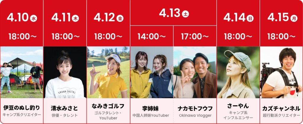 人気クリエイターの伊豆のぬし釣りさん、女優の清水みさとさん、タレントのなみきゴルフさんらを日替わりでゲストに迎え、「キャンプ」「サウナ」「ゴルフ」などゲストの様々な「スキ!」とBYDのEVのある暮らしをかけ合わせたトークイベントを実施します。さらに、トークイベントにご参加のうえ、ご質問をいただいた方には、登壇ゲストのサイン入りチェキをプレゼント(※2)いたします。トークイベントの観覧は、特設サイト(https://byd.co.jp/byd-auto/arikamo/byd_park )内からご予約(※3)いただけます。