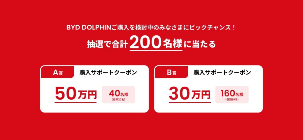 特設サイトのフォームより応募いただくことで、抽選により、お支払い時の購入資金として活用いただける「購入サポートクーポン50万円分」を40名様に、「購入サポートクーポン30万円分」を160名様に、合計200名様に進呈いたします。クーポンは、全国のBYD正規ディーラーにて、「BYD DOLPHIN」または「BYD DOLPHIN Long Range」をご購入される際にご使用いただけます。キャンペーンの詳細はキャンペーンサイトにてご確認ください。